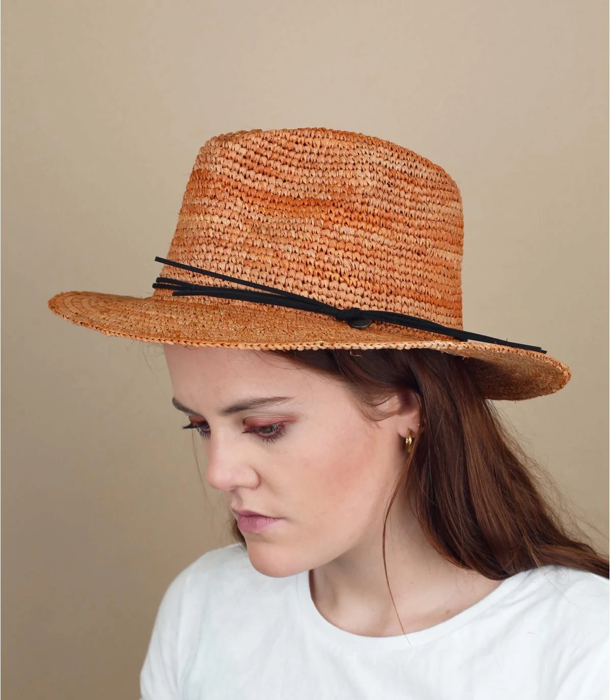Protégez-vous du soleil et affichez un style au charme campagnard, avec ce chapeau en paille caramel, relevée d’un discret lien noué sur le côté. Son large bord vous fera de l’ombre et donnera un air nonchalant à vos tenues estivales.