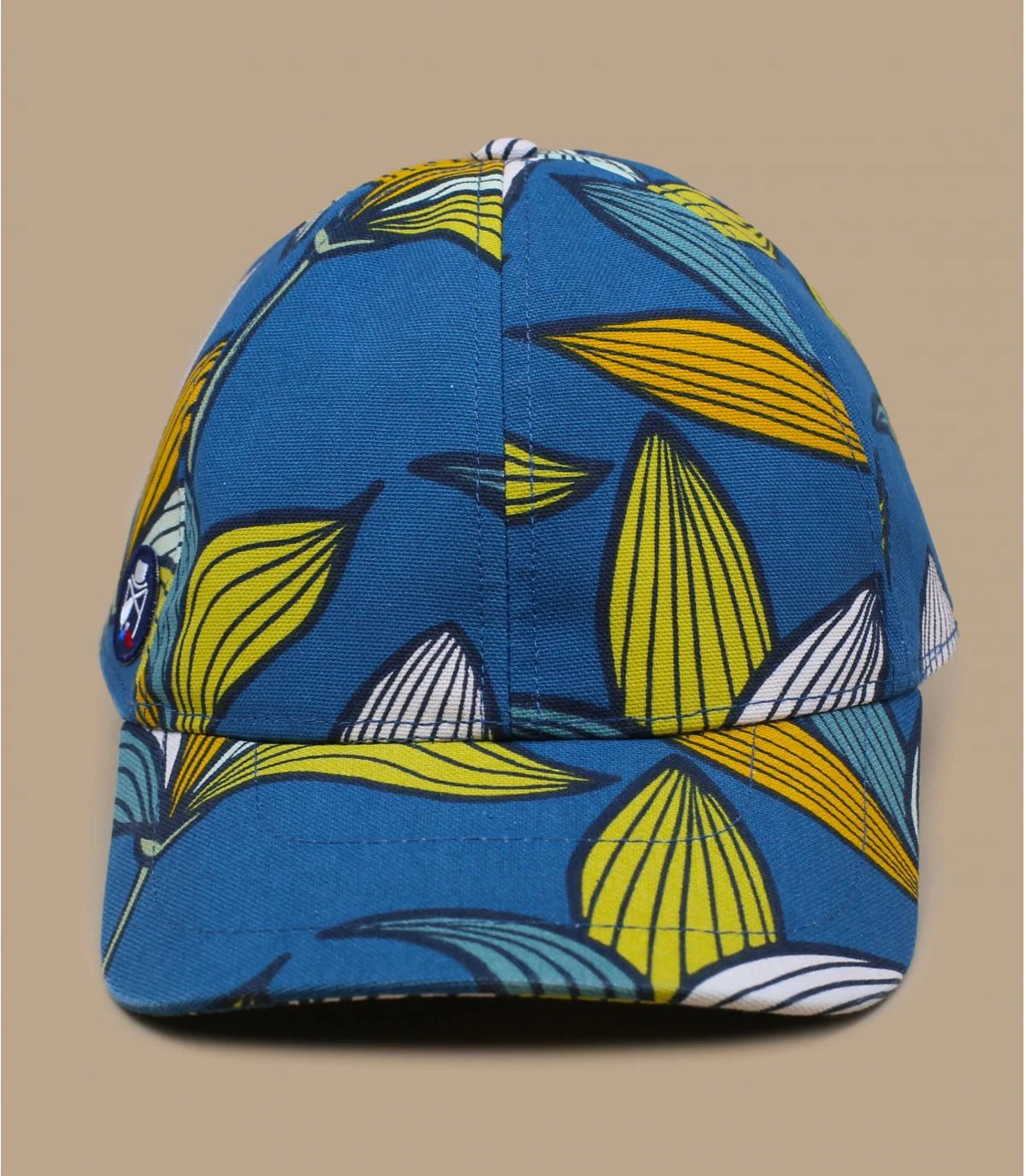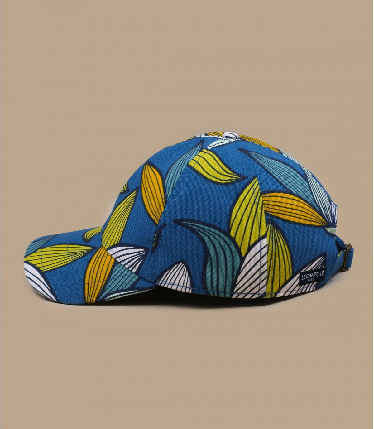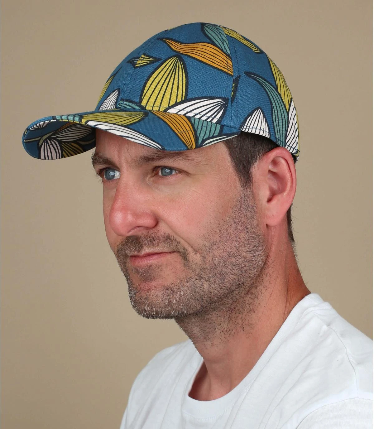 Un joli motif végétal aux éclats de jaune qui pourrait être un tissu wax africain illumine cette casquette bleu vert à visière courbée, confectionnée à la main dans une toile 100 % coton. Ajustable au dos par un système strapback assorti, cette sympathique casquette fait honneur à la jeune marque parisienne Le Chapoté.